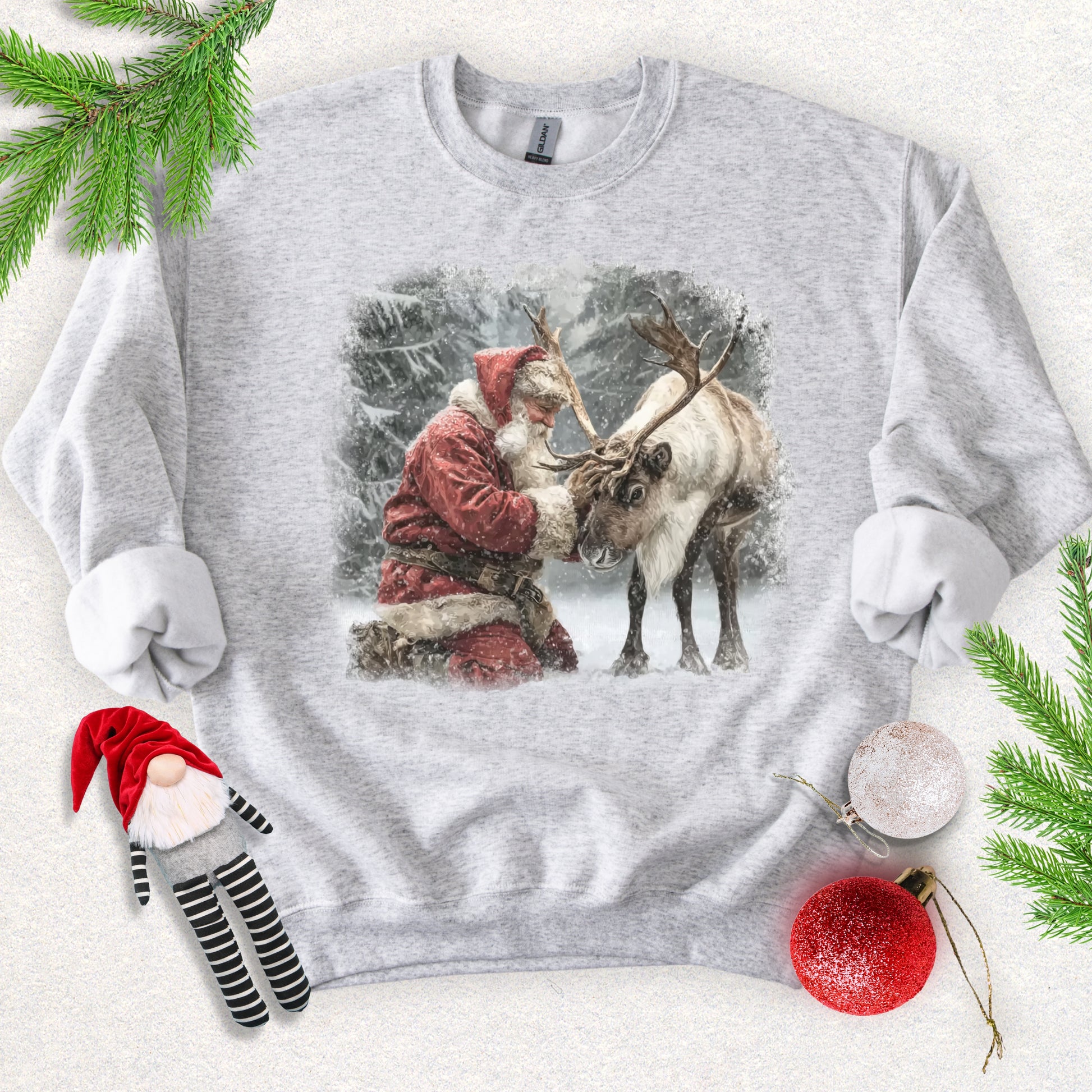 This cozy crewneck sweatshirt carries a quiet, wintry story across its front — a weathered Santa in a scarlet coat kneels beside a gentle reindeer under falling snow. The soft white fabric brightens the detailed artwork, where muted grays and warm reds create a nostalgic, painterly scene. Wear it on crisp mornings while sipping something hot, or layer it over a flannel for a slow walk through evergreen-lined streets. It sits comfortably in an everyday wardrobe while bringing a subtle seasonal mood: calm, reflective, and a little bit magical.